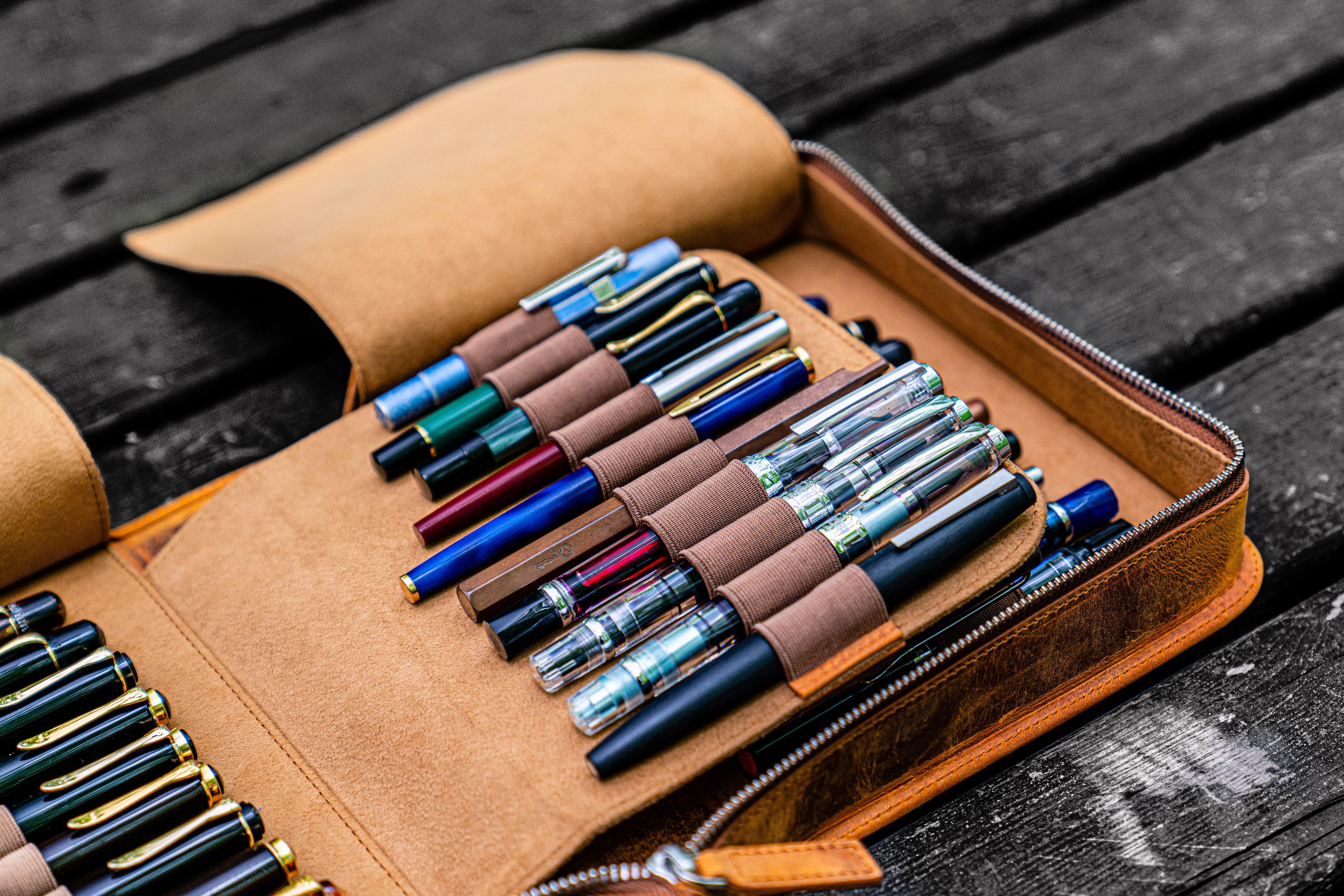 This Crazy Horse Brown Leather Zippered Pen Case has a velvet lined interior and holds up to 40 pens. When you want to carry or store your favorite pens, you want them protected in your bag, purse or pocket to avoid ink leaking everywhere or getting them scratched. This leather pen holder is great to protect your fountain pens and keep them safe.
