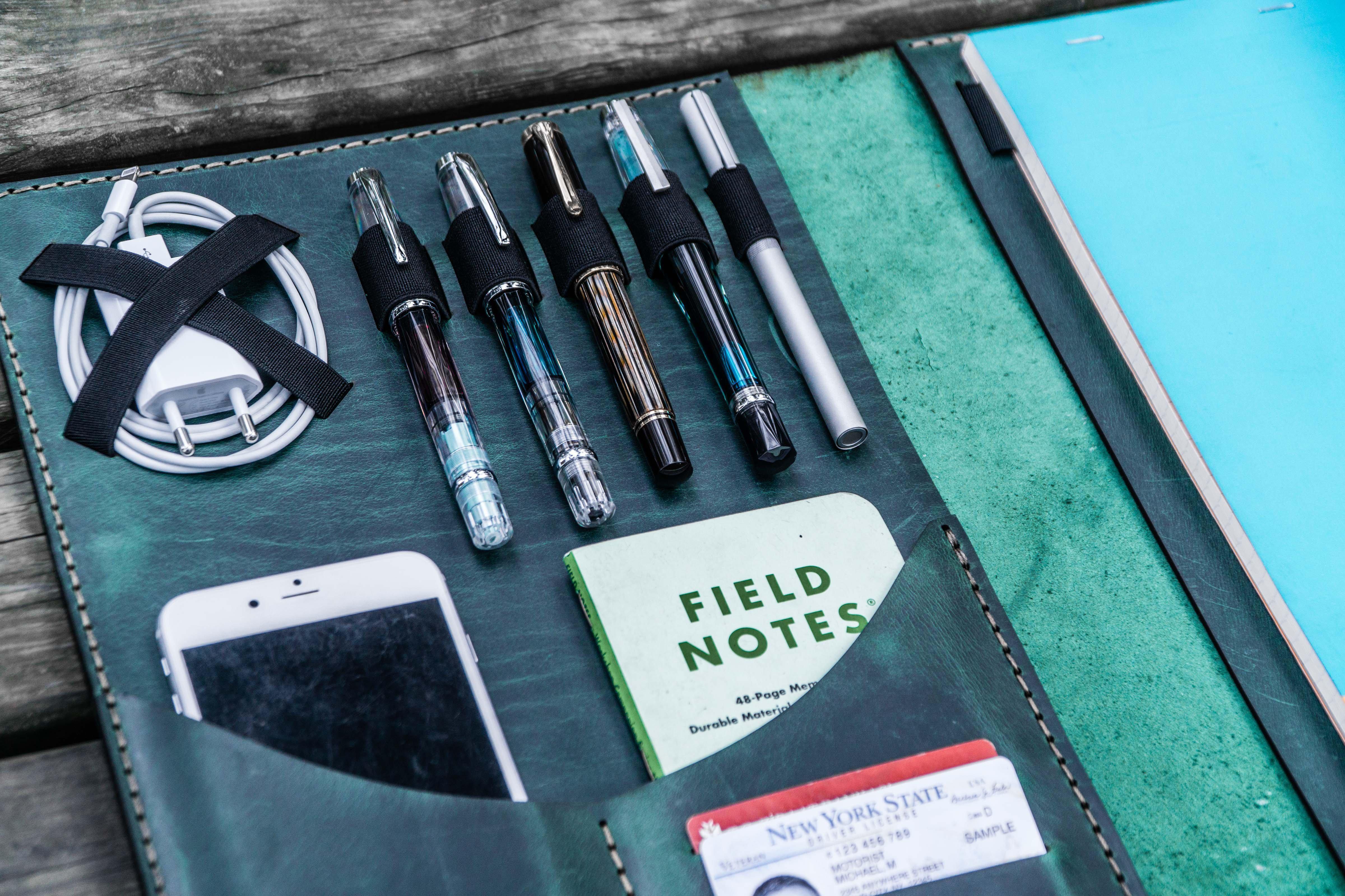 Protect your valuables in one safe place and save yourself the hassle of rumaging around your bag for all your everyday essentials with our Handmade Leather Leuchtturm1917 A4 Leather Cover Portfolio. It's the perfect way to store your EDC essentials for work, study or personal use.