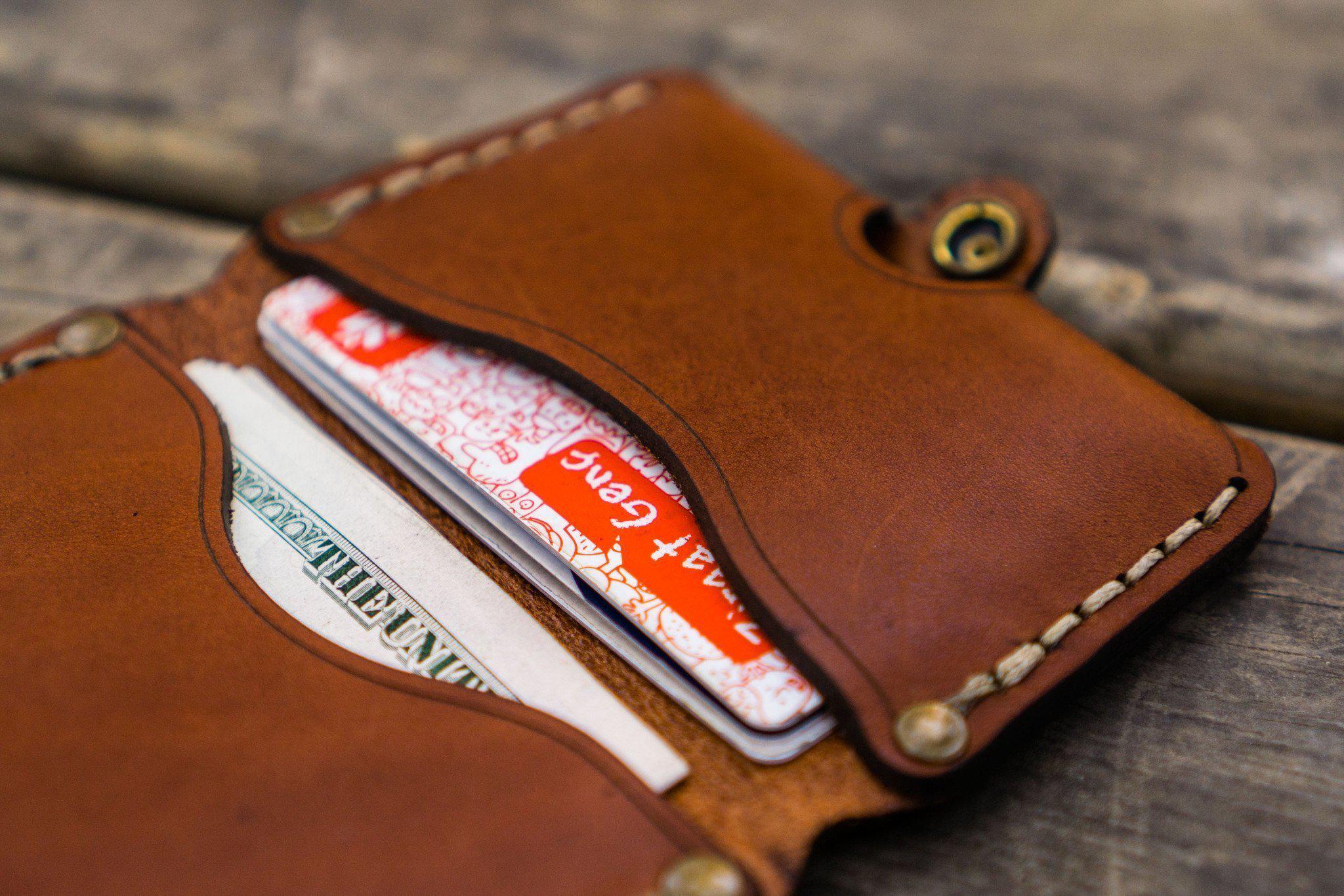 Keep your bank and credit cards safely together with the button closed handmade leather wallet and card holder. There are two internal card pockets that hold up to 5-6 credit cards, ID cards or cash. With a stylish minimalist design, its perfect for slipping into your pocket or bag. You also have the option of personalizing with initials.