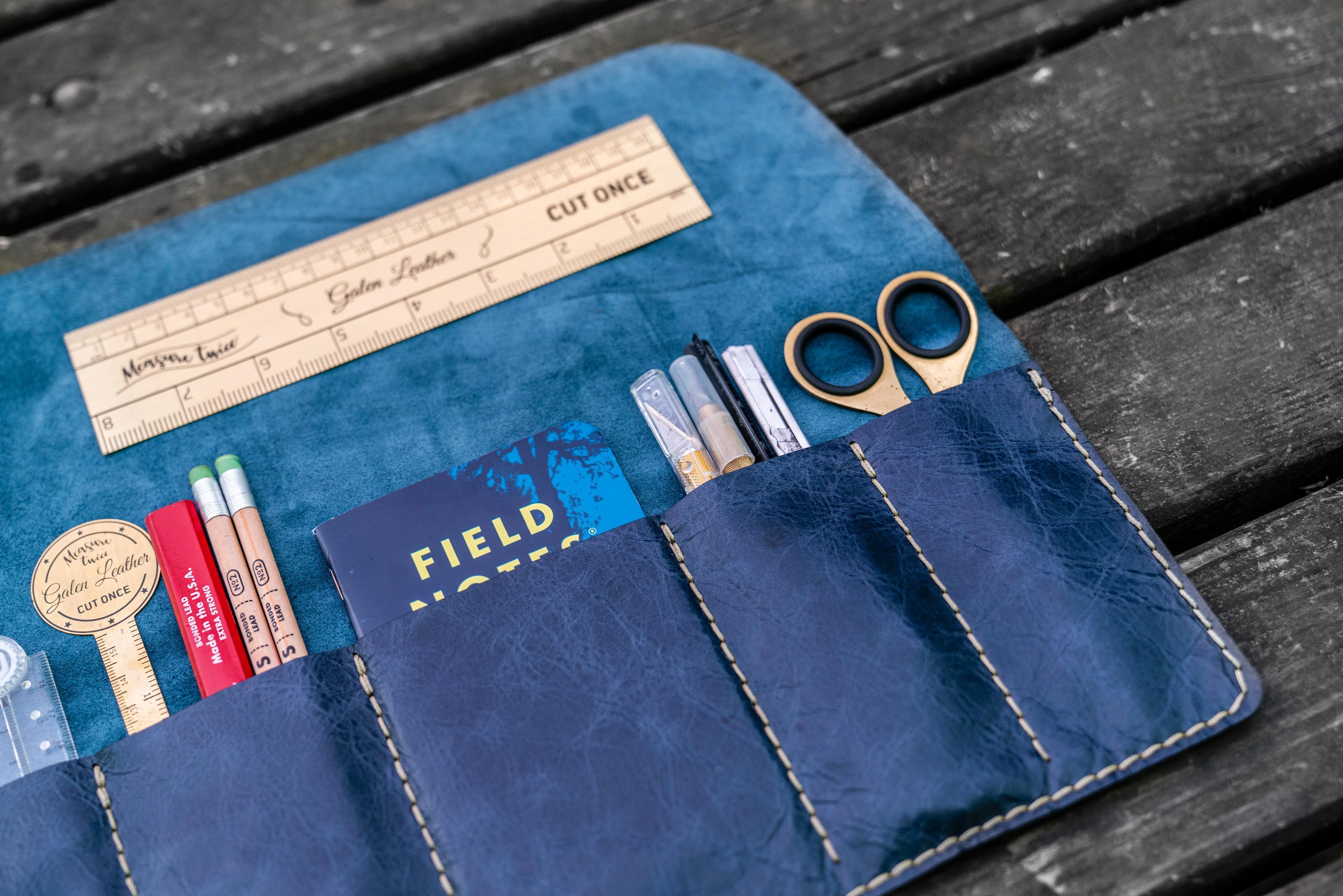 This roll up Leather Pen and Tool Case is the perfect way to store and transport your pens, pencils and other accessories with style and class. Whether you're a craftsperson, painter, makeup artist, carpenter, handyman/woman, or simply need a practical way to carry your stationary items around, this tool roll will do the job perfectly. You can close it tightly with an adjustable leather strap so it fits neatly in the palm of your hand.