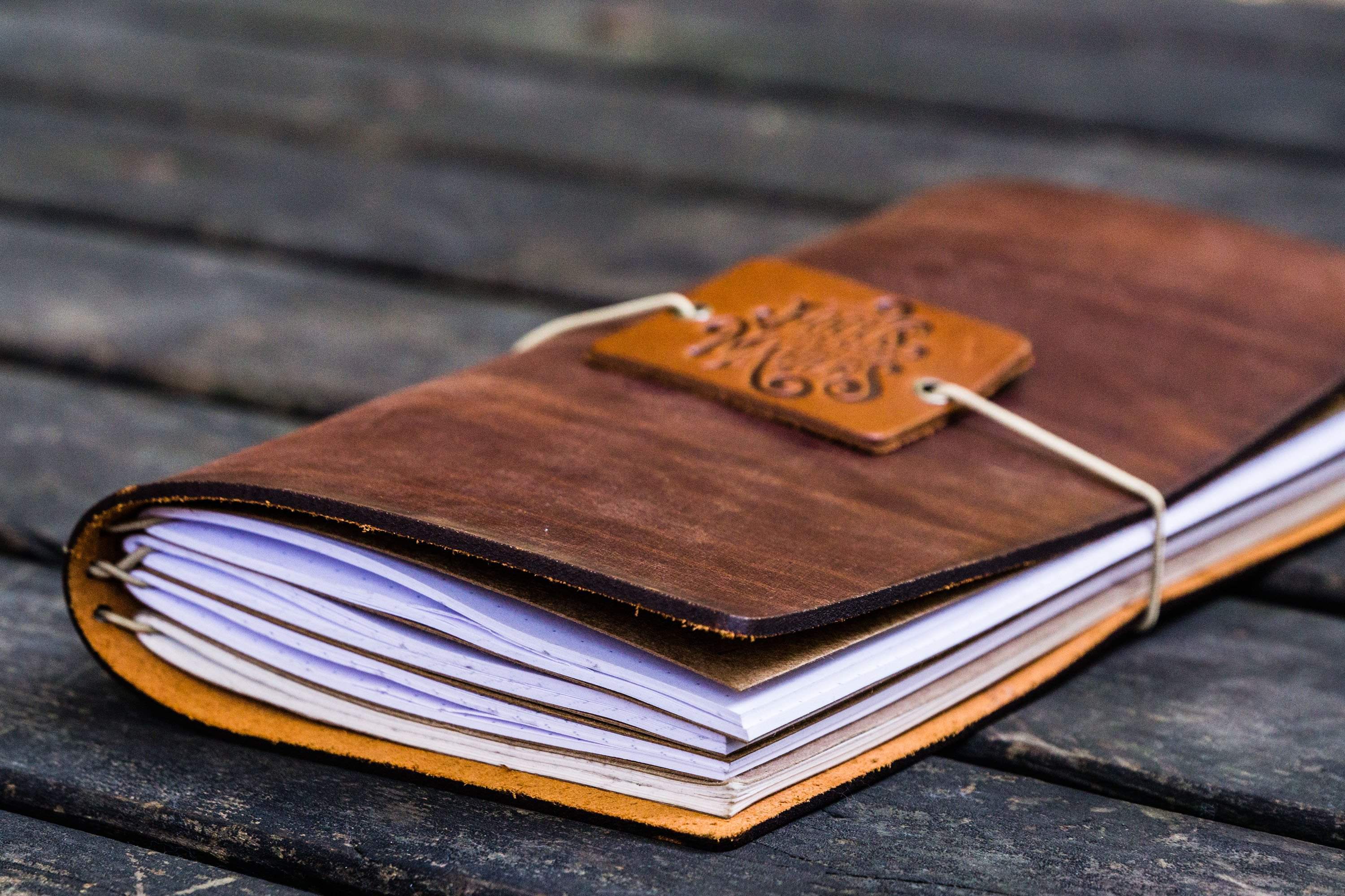 This gorgeous Handmade Leather Traveler's Notebook Cover is a perfectly stylish way to store your travel journal or notebooks for recording all your precious memories and travel tales. Made from well-aged leather, it has four standard elastic bands to secure 4-6 notebooks (depending on size).
